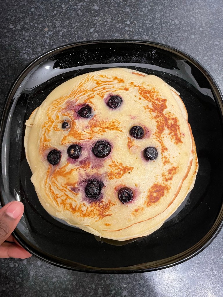 - Put your frying pan on medium heat and spray your vegetable / sunflower oil. Add a serving spoon of batter to heat, place your blueberries in the batter of pancake in the fry pan as soon as it’s been placed on heat. Flip the pancake till both sides are ready. Repeat until all batter is cooked.