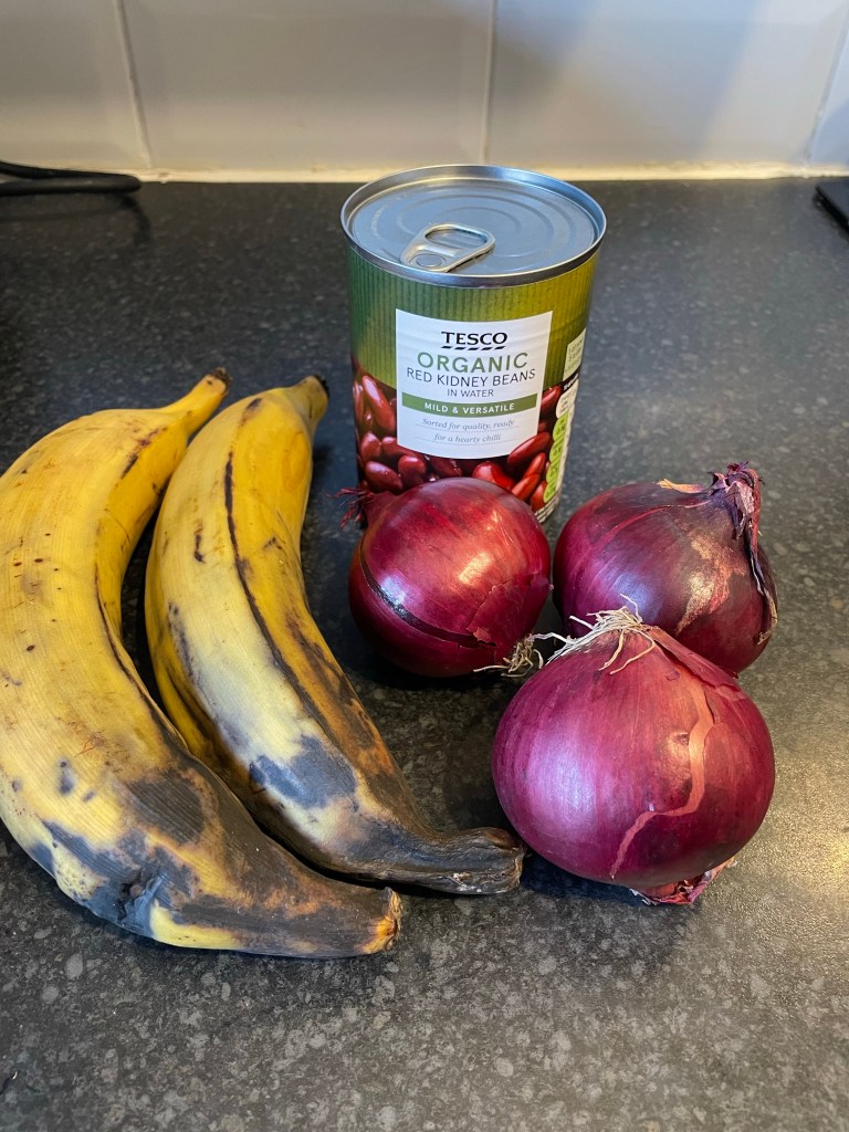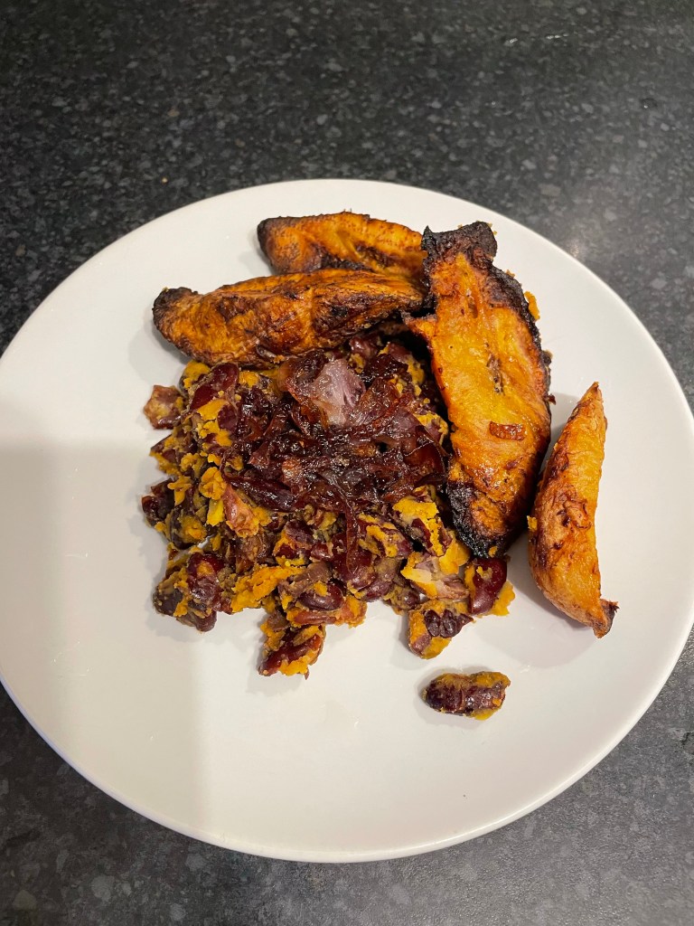 Serving: My usual plate normally contains a portion of bean, fried plantains and onion sauce ©