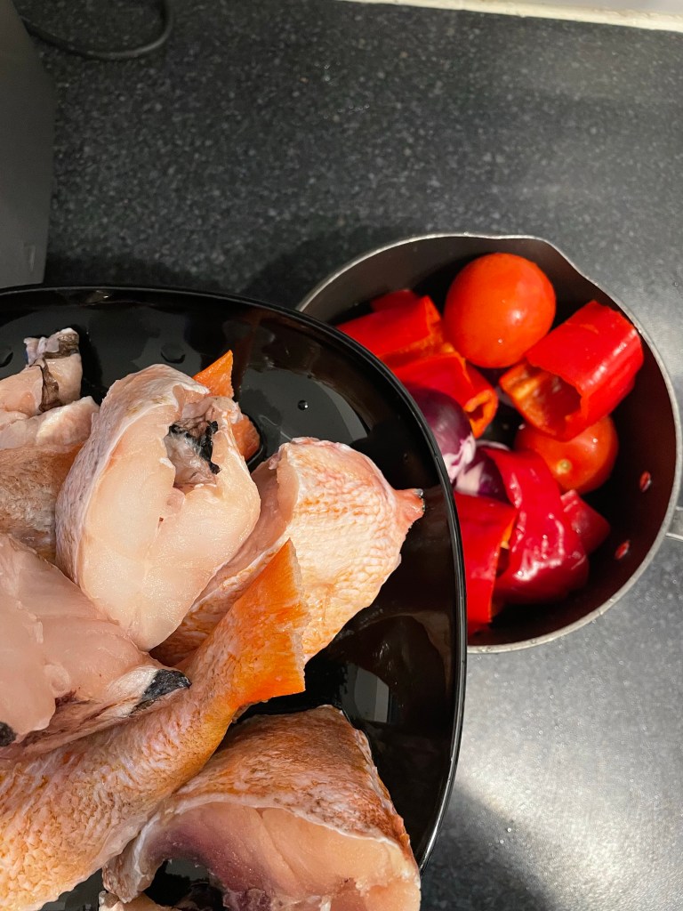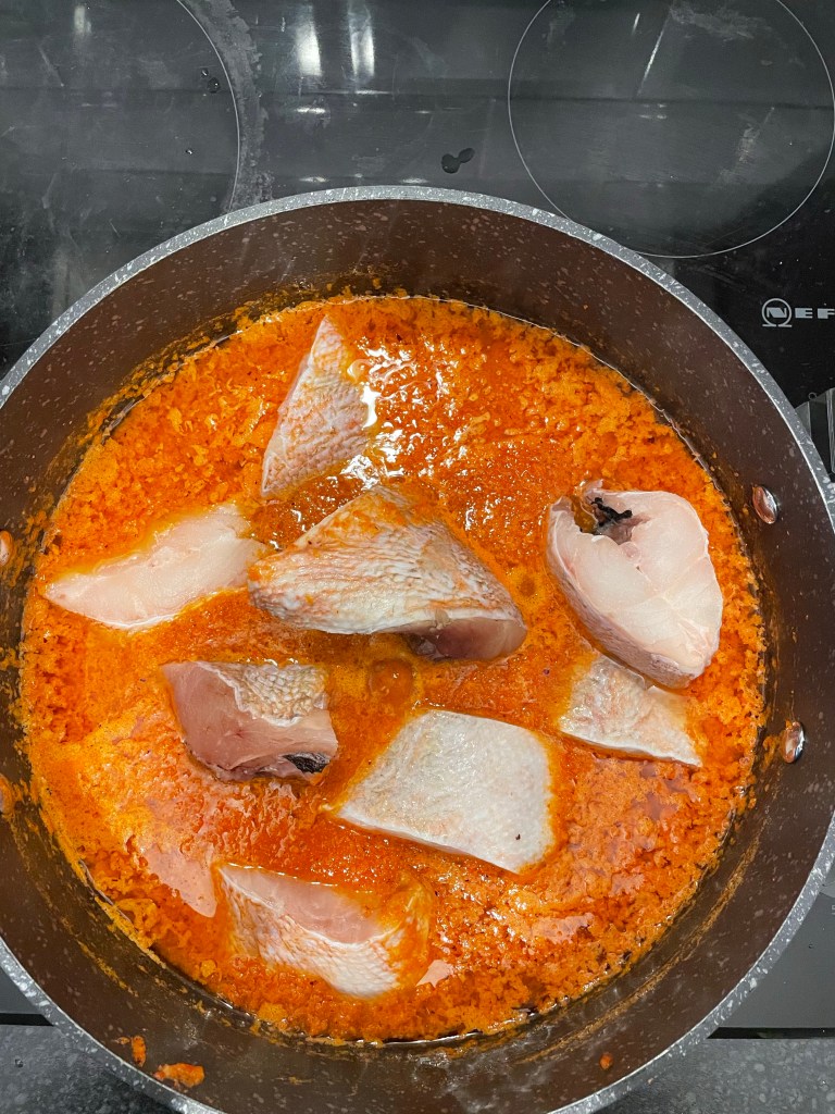 - Add the red bream to the stew pot and close to cook for 10-15 minutes. Allow fish to be fully immersed in the pepper, cook and set aside.