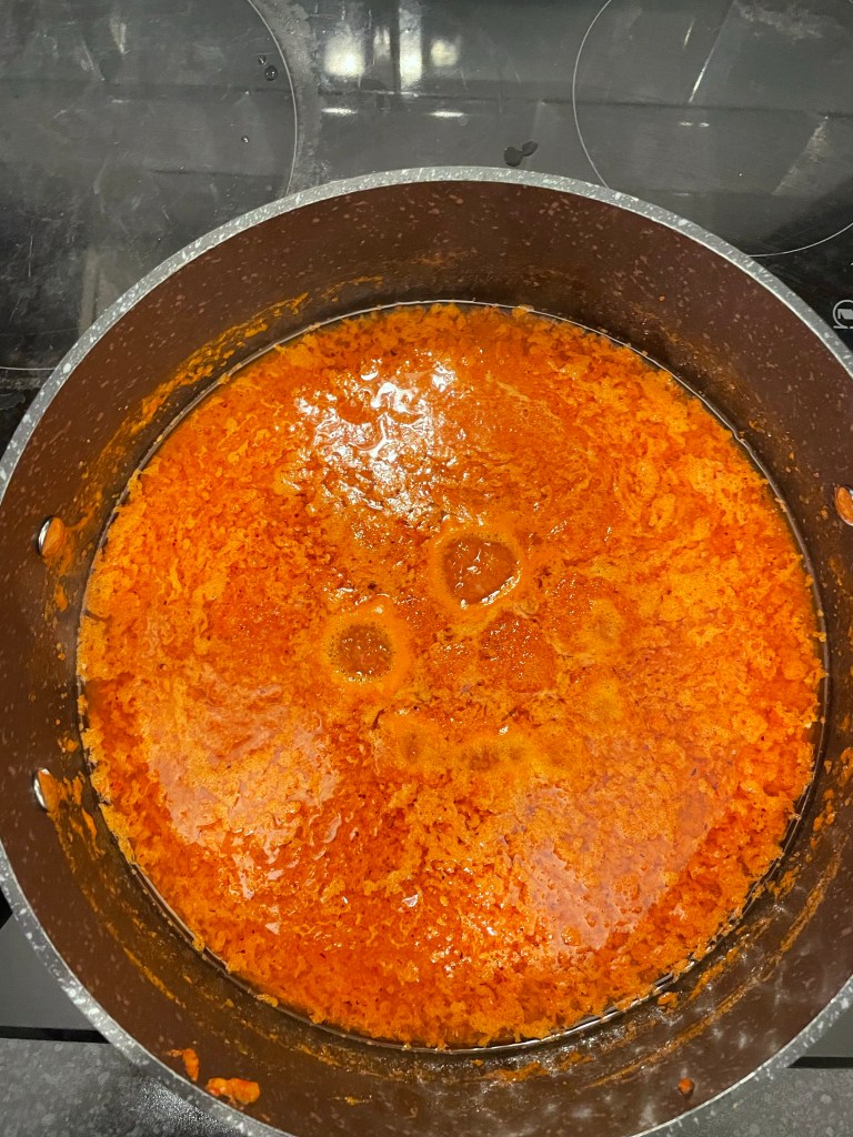 - Pour blended peppers into a clean pot and add 5 tbsp olive oil, season with sea salt, then close the pot with lid. Allow to simmer for 2-3 minutes.